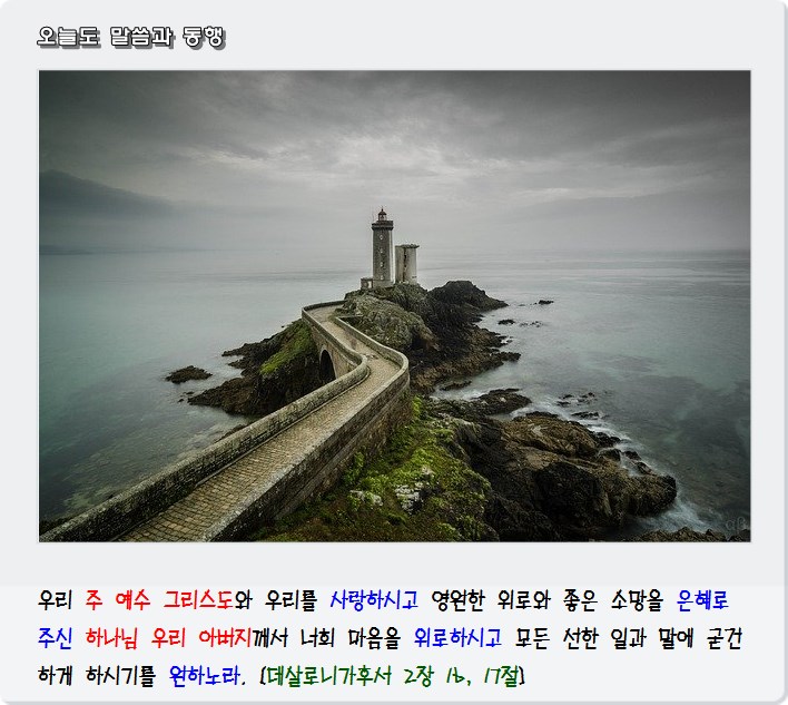 우리 주 예수 그리스도와 우리를 사랑하시고 영원한 위로와 좋은 소망을 은혜로 주신 하나님 우리 아버지께서 너희 마음을 위로하시고 모든 선한 일과 말에 굳건하게 하시기를 원하노라. [데살로니가후서 2장 16, 17절]
