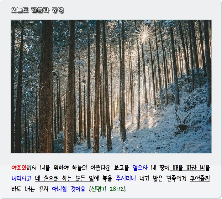 여호와께서 너를 위하여 하늘의 아름다운 보고를 열으사 네 땅에 때를 따라 비를 내리시고 네 손으로 하는 모든 일에 복을 주시리니 네가 많은 민족에게 꾸어줄찌라도 너는 꾸지 아니할 것이요 [신명기 28장 12절]