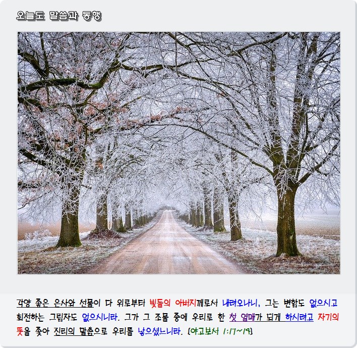 각양 좋은 은사와 선물이 다 위로부터 빛들의 아버지께로서 내려오나니, 그는 변함도 없으시고 회전하는 그림자도 없으시니라. 그가 그 조물 중에 우리로 한 첫 열매가 되게 하시려고 자기의 뜻을 좇아 진리의 말씀으로 우리를 낳으셨느니라 [야고보서 1:17~19]