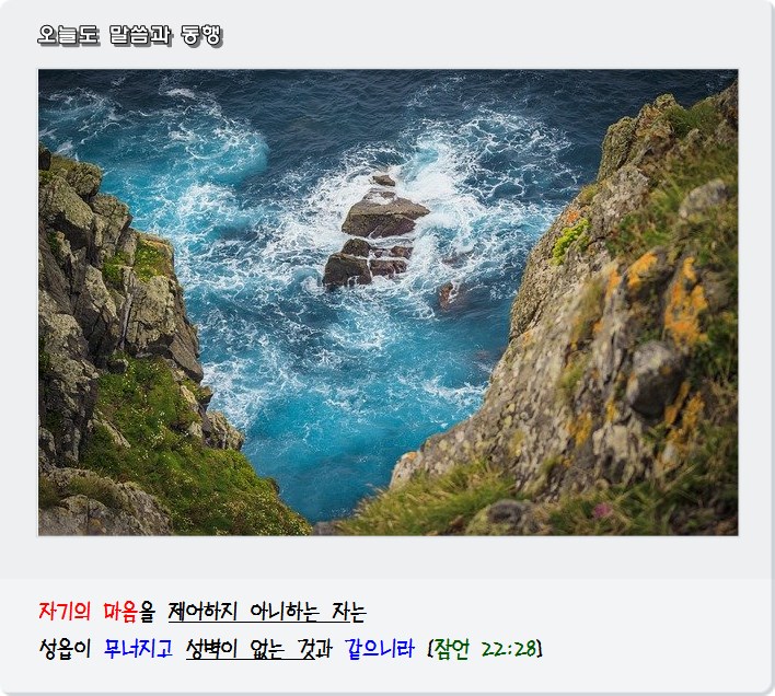 마음을 조절하는 것이 지카는 것입니다. 조금만 참았다거나 서둘렀으면 오늘의 잠언처럼 되지 않았을 겁니다. 성벽이 무너지고 성벽이 없어서 자신을 지킬 수 없는 상태가 되기 때문입니다.