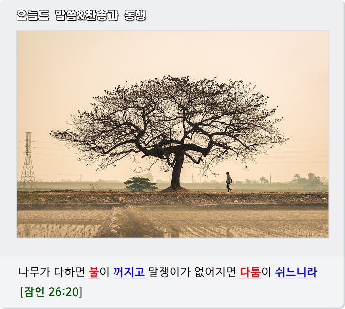 나무가 다하면 불이 꺼지고 말쟁이가 없어지면 다툼이 쉬느니라 [잠언 26:20]