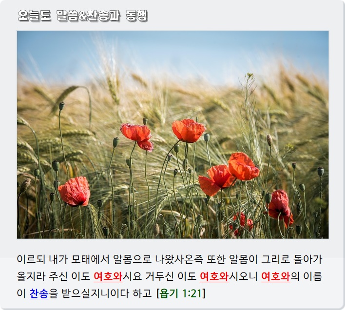 이르되 내가 모태에서 알몸으로 나왔사온즉 또한 알몸이 그리로 돌아가올지라 주신 이도 여호와시요 거두신 이도 여호와시오니 여호와의 이름이 찬송을 받으실지니이다 하고 [욥기 1:21]